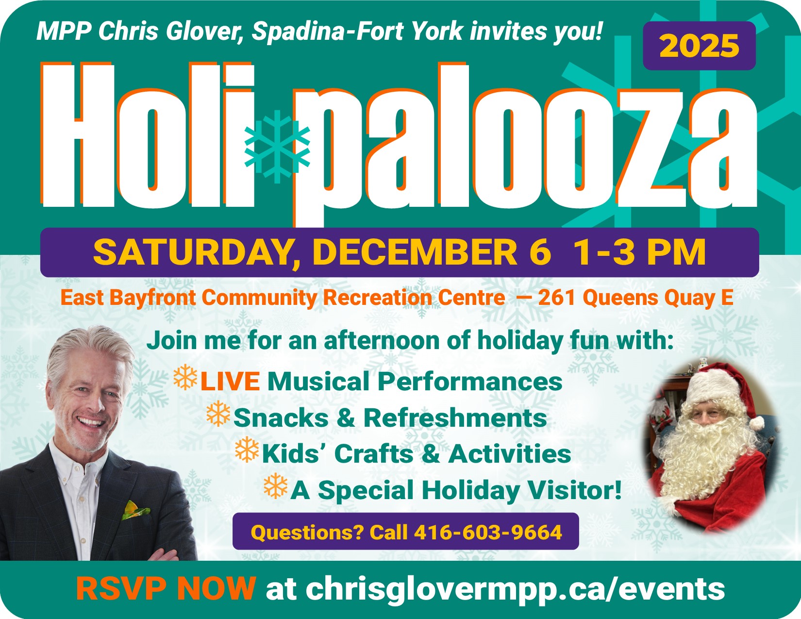 It’s that time again and we are gearing up for our annual holiday party and concert – Holipalooza! Join me on Saturday, December 6, 1-3 pm at the brand-new East Bayfront Community Recreation Centre located at 261 Queens Quay East. Everyone is welcome for an afternoon of live music, refreshments, kids’ crafts and activities, and a special visitor!